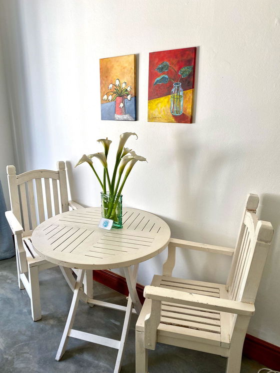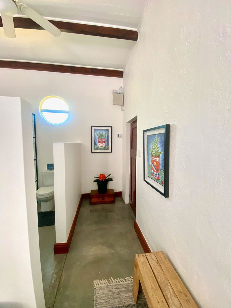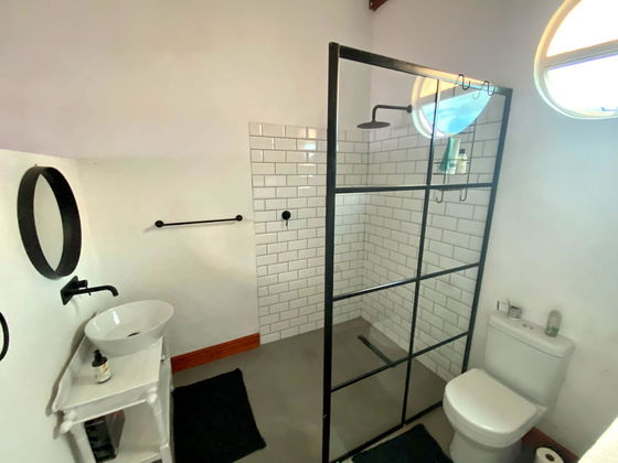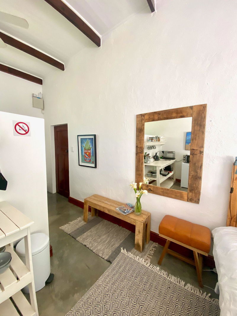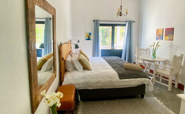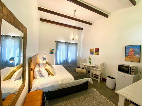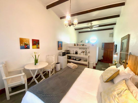 Lovely small studio apartment with high wooden ceilings and a king bed/two single beds, kitchenette with microwave and bar fridge. The bathroom is part of the room and has a shower. The room opens onto a private patio and the peaceful courtyard with plunge pool and greenhouse.